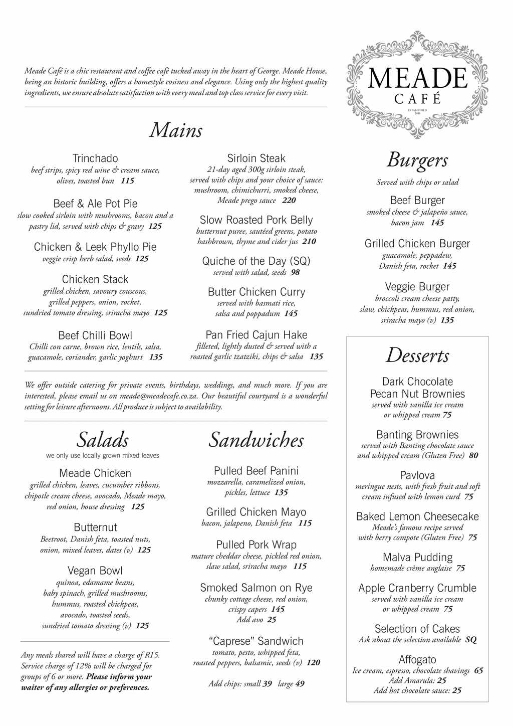 Nestled in one of the original historic houses in George, Meade Cafe is a delightful oasis where history meets modern charm. Our beautifully maintained garden provides a serene backdrop for any occasion, whether you're here to relax with friends, celebrate a special event, or attend a private evening function.
